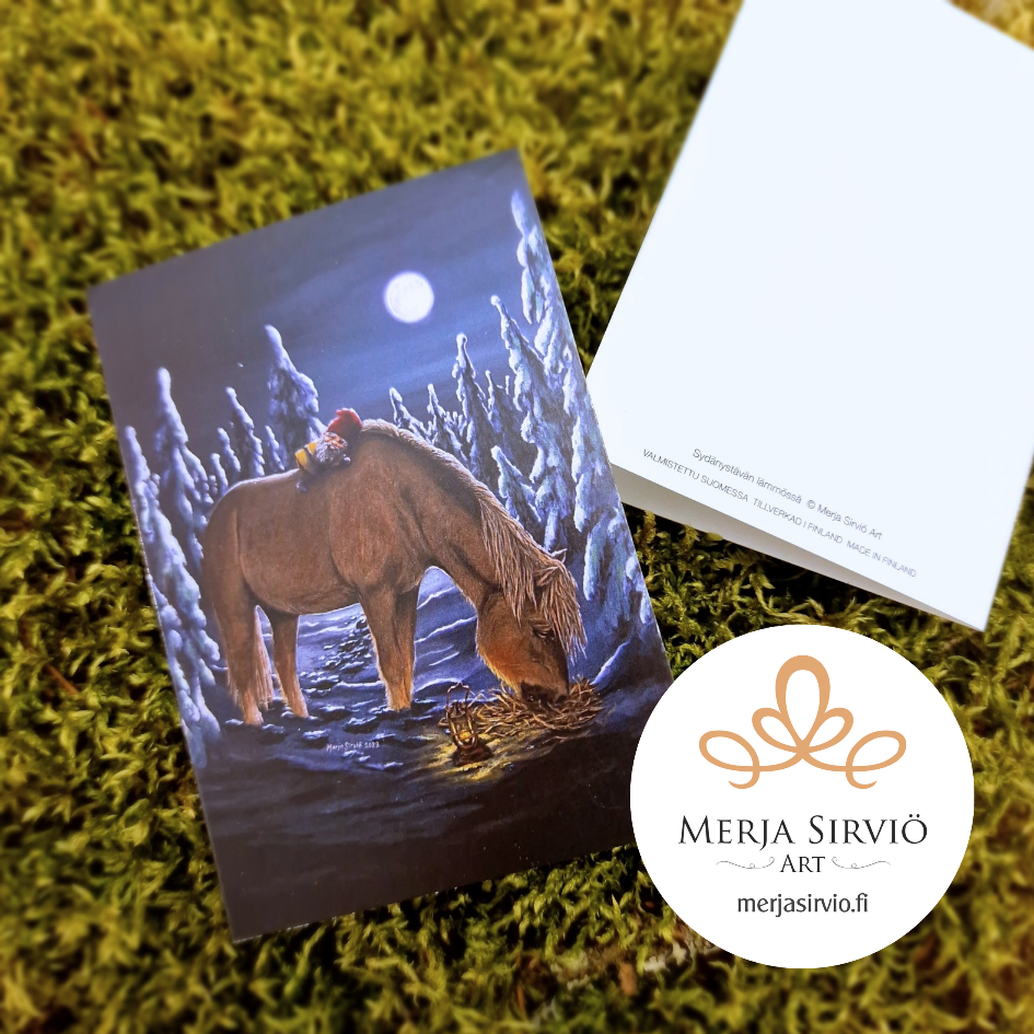 Suomenhevos- ja tonttuaiheinen joulukortti Sydänystävän lämmössä