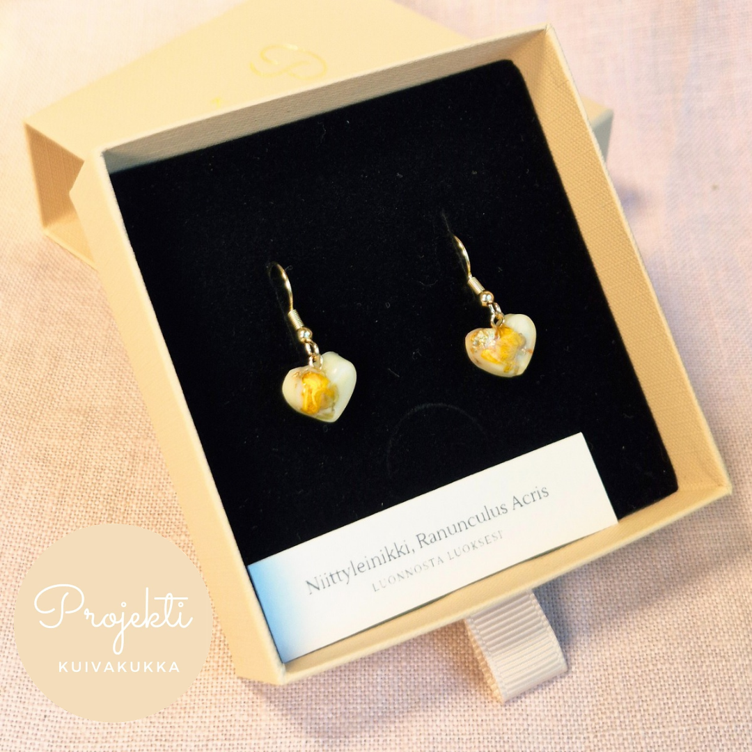 Tuo niittyjen aurinko ja kesäiset tuulenvireet osaksi tyyliäsi niittyleinikki-korvakoruilla. Käsin poimittu niittyleinikki on säilötty kirkkaaseen hartsipintaan, jossa sen kirkas keltainen väri ja herkät terälehdet pääsevät loistamaan kuin auringonsäteet heinäkuisessa niityssä. Tämä pieni kukka, täynnä kesän raikkautta ja elinvoimaa, tuo luonnon kauneuden, joka ei koskaan kuihdu.